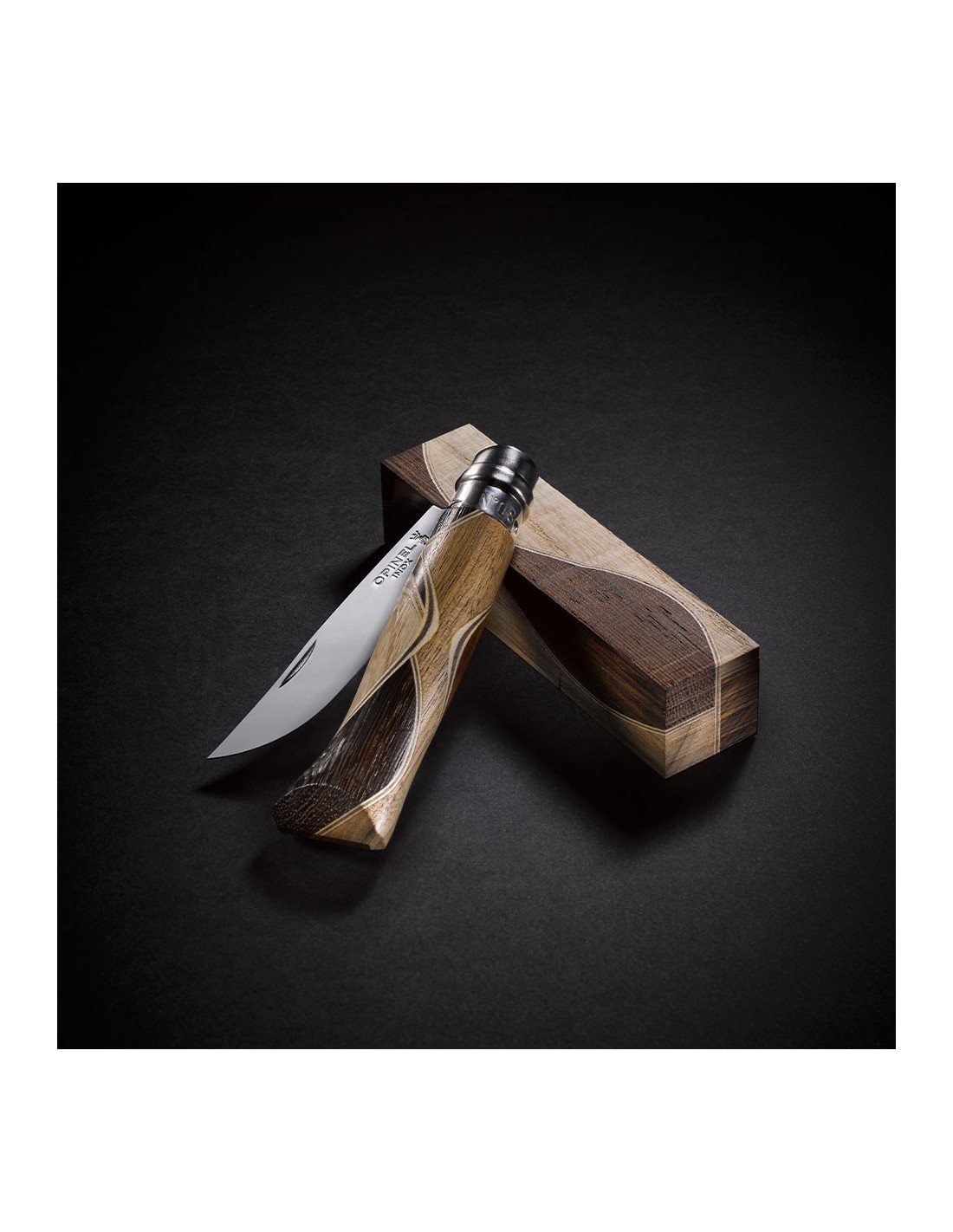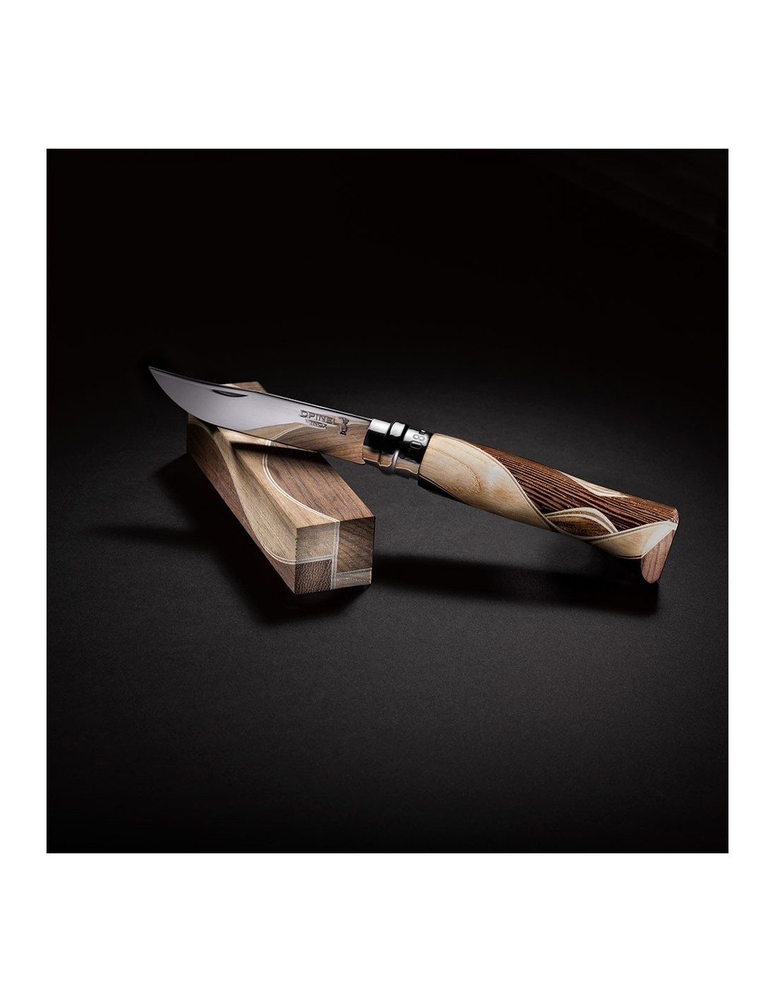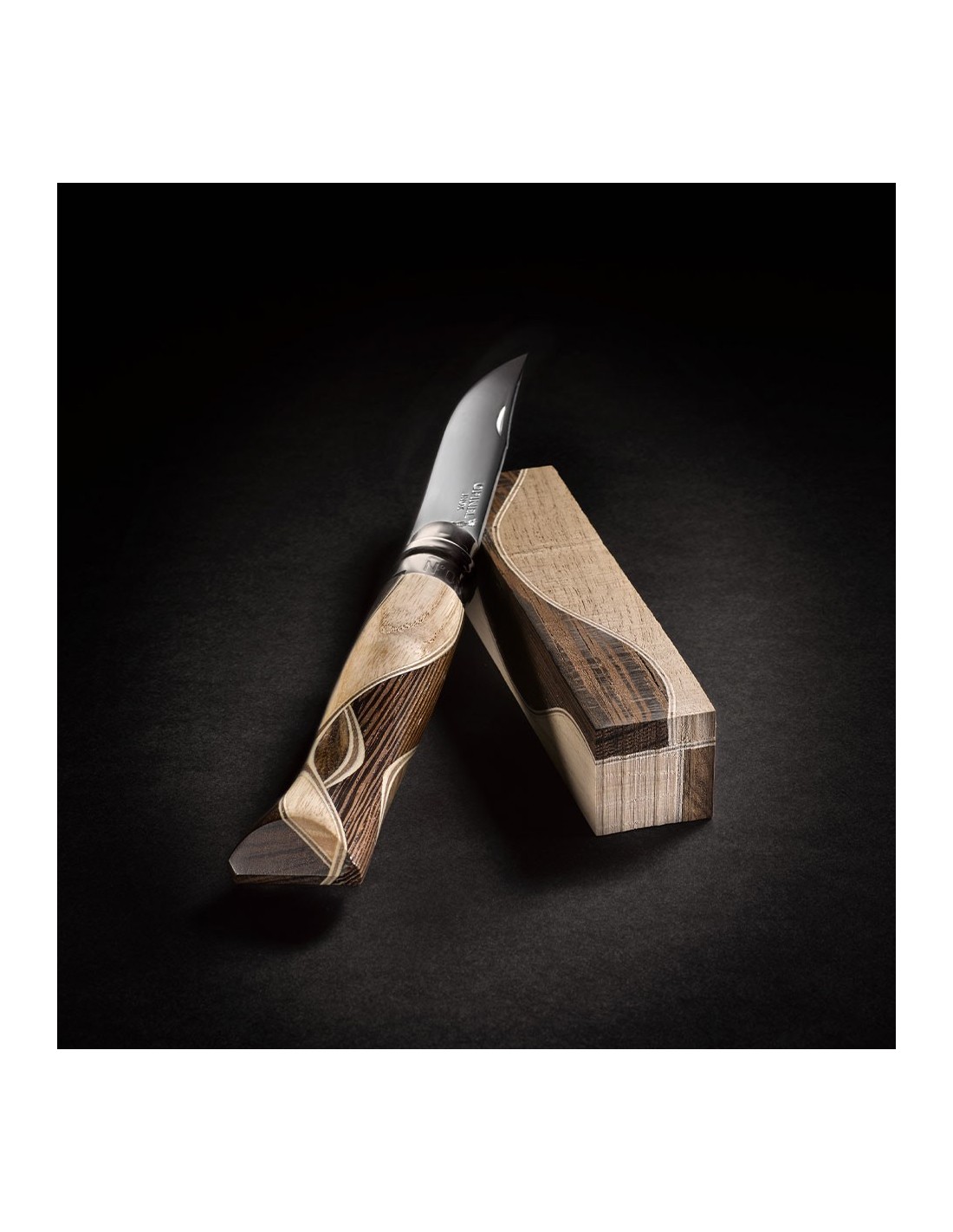 Manerul este realizat in fabrica Opinel printr-un procedeu de marchetarie, inventat de Bruno Chaperon. Procedeul consta in asamblarea a patru specii diferite de lemn (abanos, lemn de trandafir, violetwood, bocote, cocobolo, zebrali, boxwood, amaranth...). Lemn exceptional cu nuante contrastante pentru un rezultat original si unic.